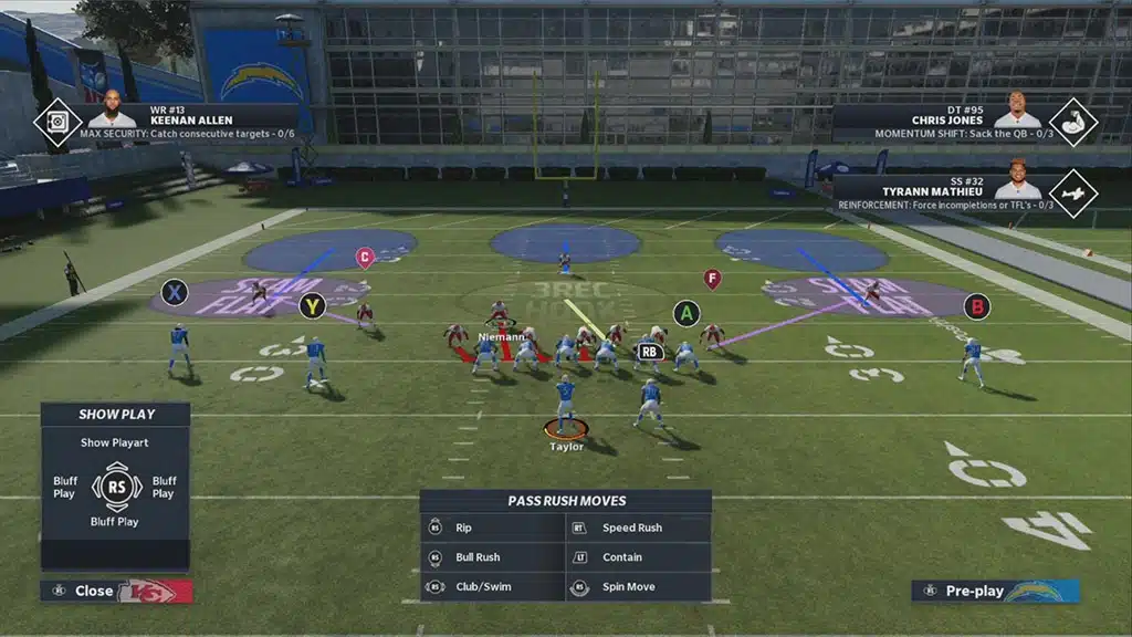 - If you have an X-Factor on the defensive line with the El Toro, use the bull rush move to get pressure on the quarterback.