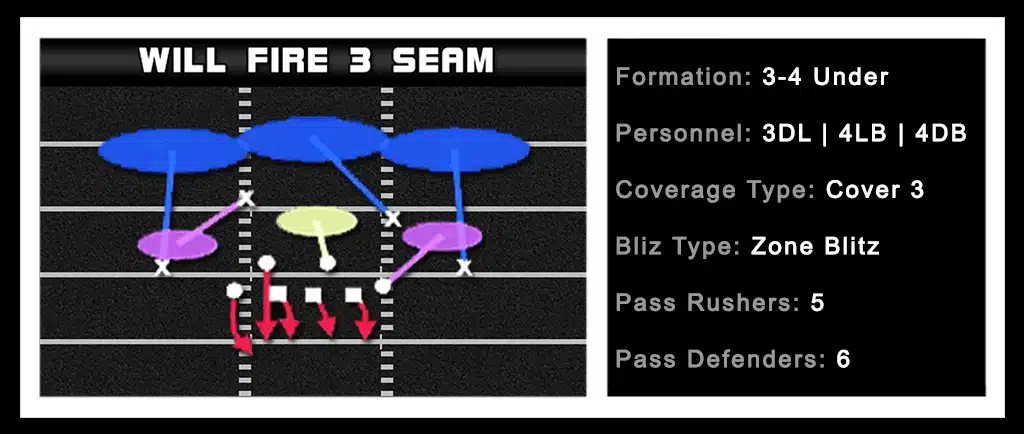 For this Madden Plays breakdown, we look at the 3-4 Under – Will Fire 3 Seam. The design of this zone blitz comes from the right inside linebacker. He shoots through the B-Gap between the left guard and left tackle.