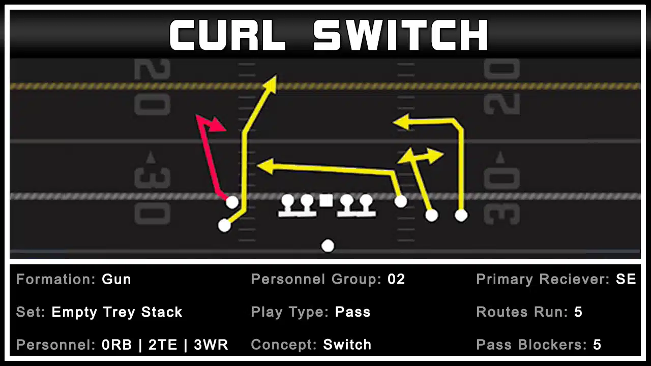 The Gun Empty Trey Stack – Curl Switch is a great passing play to call that features 3 Press Man Beaters to beat bump and run man coverage or press coverage. There is no way your opponent can cover all three routes manually.