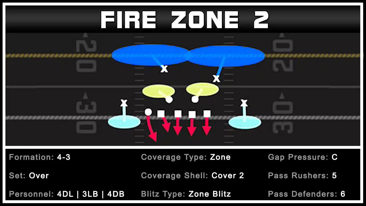 The three setups from the 4-3 Over – Fire Zone 2 create A and C Gap Pressure With A Five Man Pass Rush. This allows us to drop 6 defenders into pass coverage, thus making more difficult for the quarterback to find an open receiver.