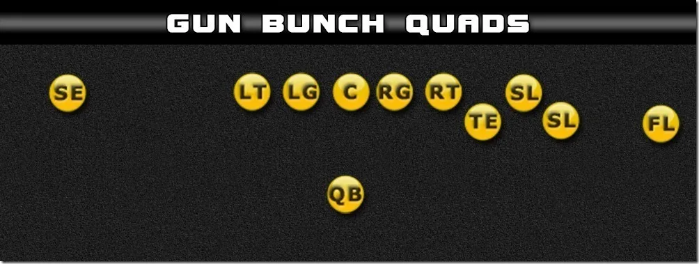The Gun Bunch Quads is a 4×1 formation that features an empty set with four receivers (1 TE, 3 WR) lined up on one side, while one receiver lines up on the other side. The formation has a total of 9 plays. Of those 9 plays, 8 of them are pass plays, while one is a run play.