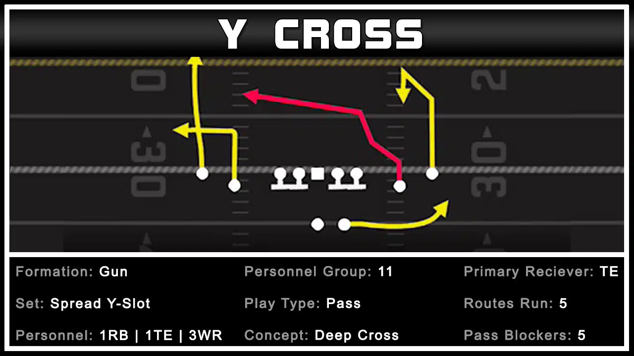 For this edition of the Madden Tips  2 Minute Drill, we look at a passing play called Gun Spread Y-Slot–Y Cross. We show how effective this passing play can be at attacking Cover 1 Robber Coverage because of the tight ends double move deep crossing route.