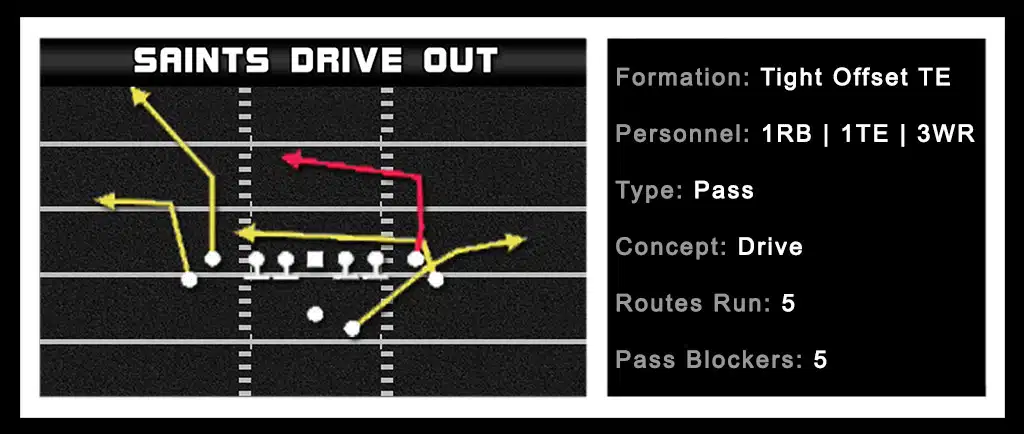 The Gun Tight Offset TE – Saints Drive Out is an excellent passing play to call to beat man press coverage (bump-n-run man coverage). All five receivers are potential threats depending on if any hot route adjustments are made.