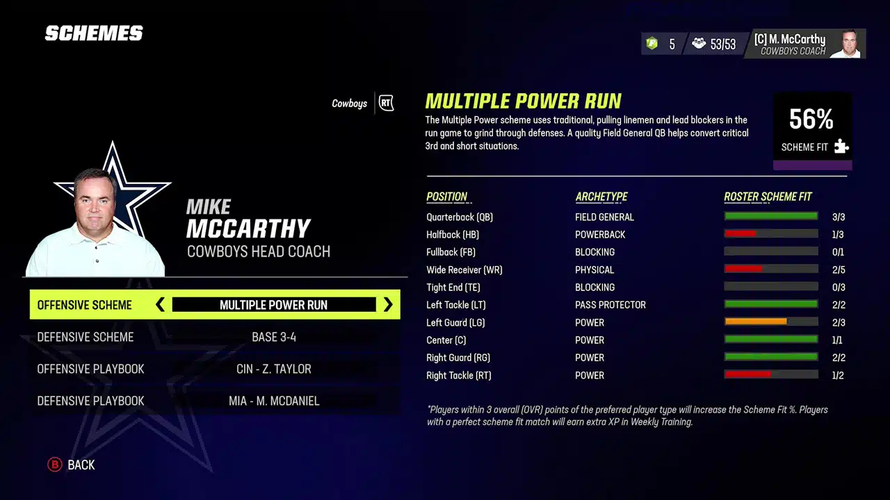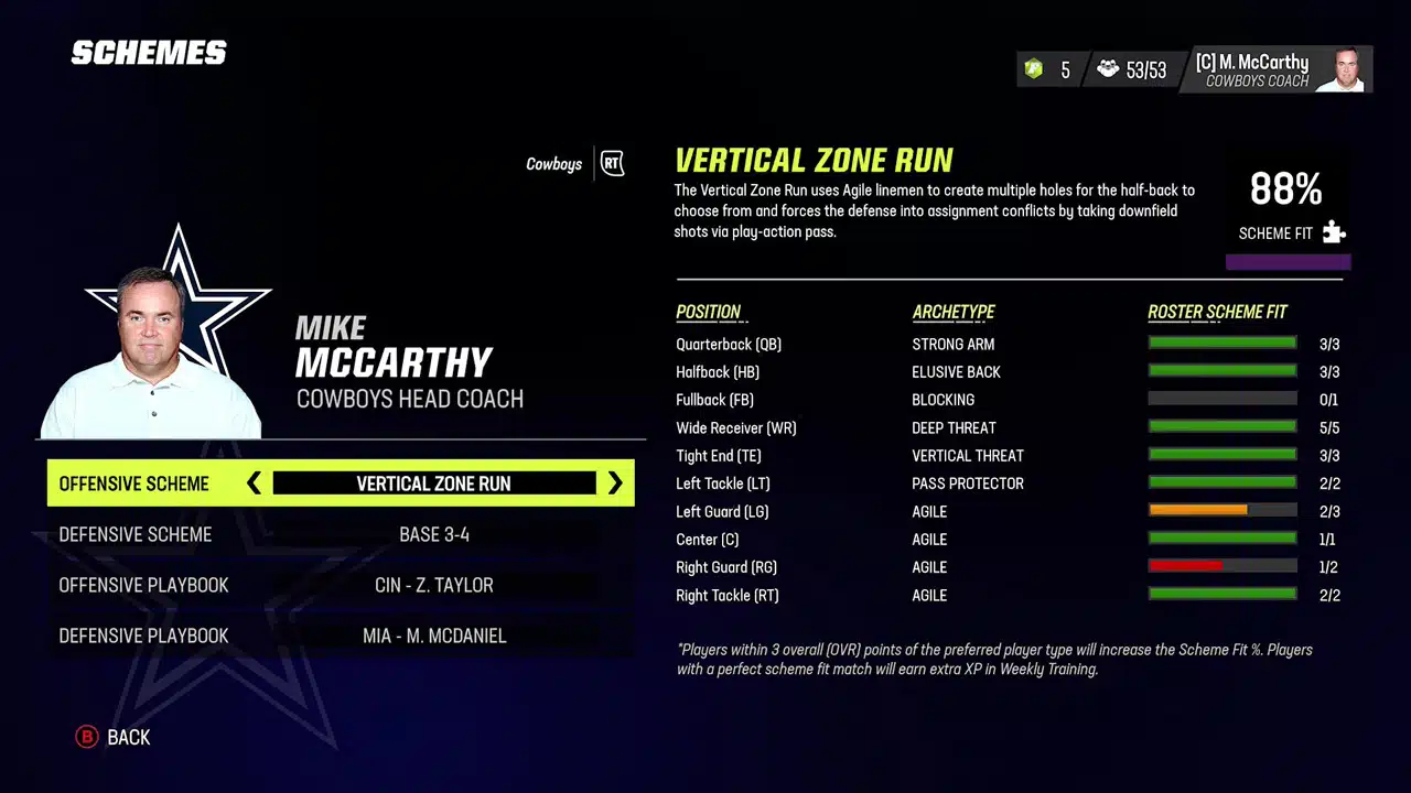 A great way to look at all the different schemes found in Madden is to go into franchise mode and then go to manage staff. There you will find schemes for each team’s offensive and defensive schemes. These are the default schemes they run based on their current roster. Look at the Roster Scheme Fit and there you can get a better idea if the scheme you want to run fits your team. For example, the Dallas Cowboys’ default scheme is Vertical Zone run which fits them at an 88% scheme fit.