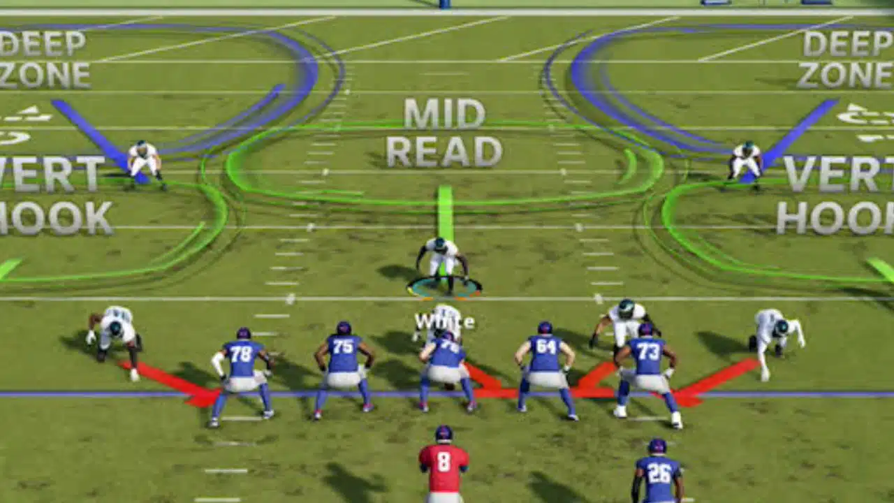 In Cover 2 defenses, the middle linebacker is typically responsible for zone assignment. The Middle-Read player must guard the deep center zone of the Cover 2 defense. He evaluates the offensive formation’s passing strength at the start of the play to see whether any receivers are posing a danger to the deep center of the field. Go to your Levels passing notion to counter the middle-read defender. The underneath option will become available as the deep receiver forces the middle-read defense out of position.