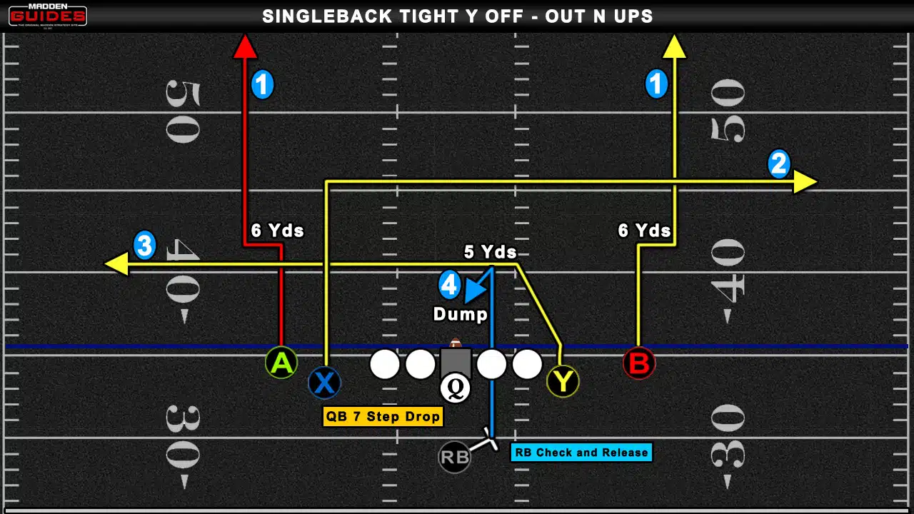 For this Madden tips video breakdown, we show a pass play called Singleback Tight Y Off – Out N Ups that’s a Cover 1 Beater. This passing play features two receivers on the outside running a double-move routes. These two out-and-up routes often allow the receivers to get open once they break up the field. The video breakdown shows how we like to get the right-side receiver wide open for a big play or even a touchdown more often than not against Cover 1 coverage.