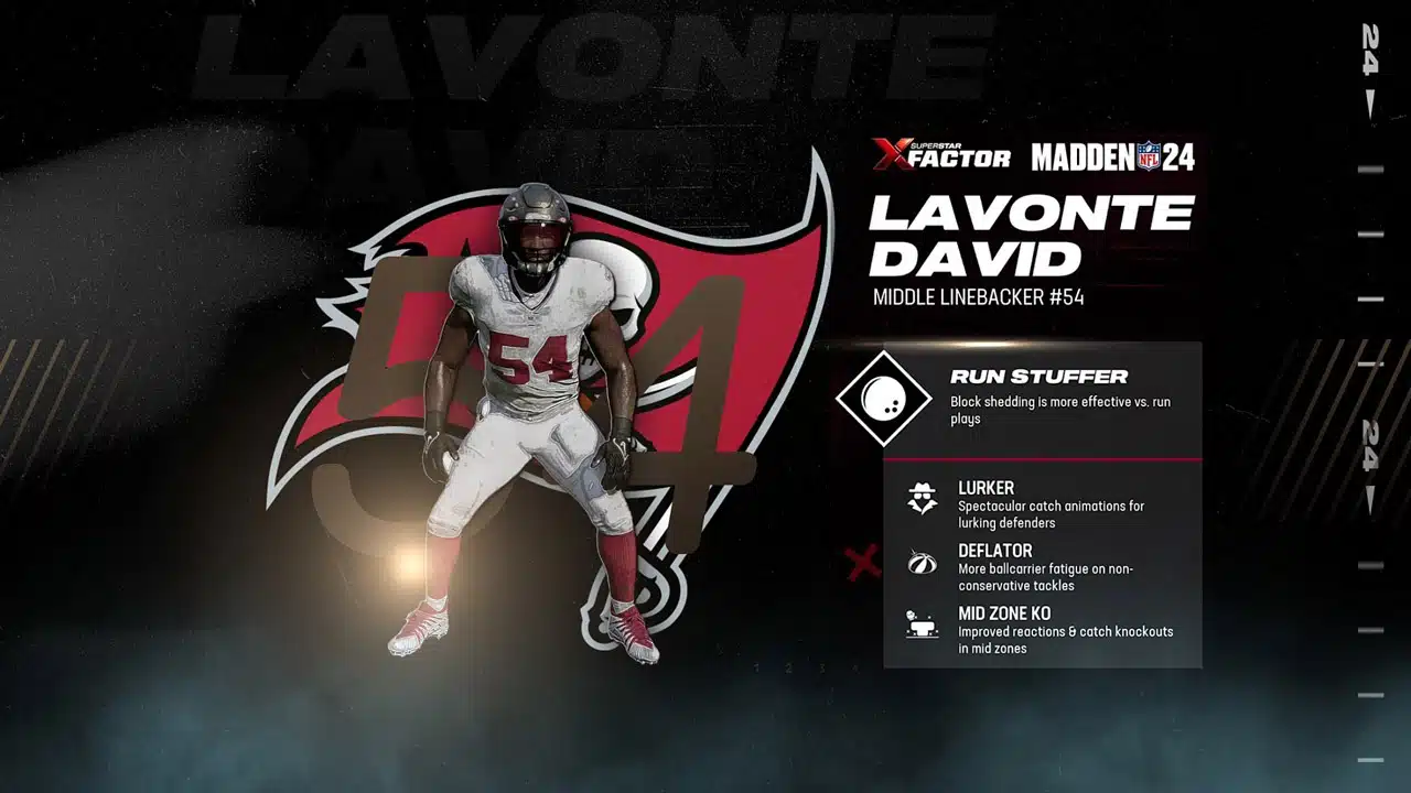 In any formidable defense, key players shine, and in this case, it’s the Tampa Bay Buccaneers’ Lavonte David. A prominent figure in our video breakdown, David’s prowess as an X Factor player is crucial to the success of our defensive strategy. His X Factor designation as a run stuffer, combined with three Superstar abilities – lurker, deflator, and mid-zone KO – render him a force to be reckoned with on the field.