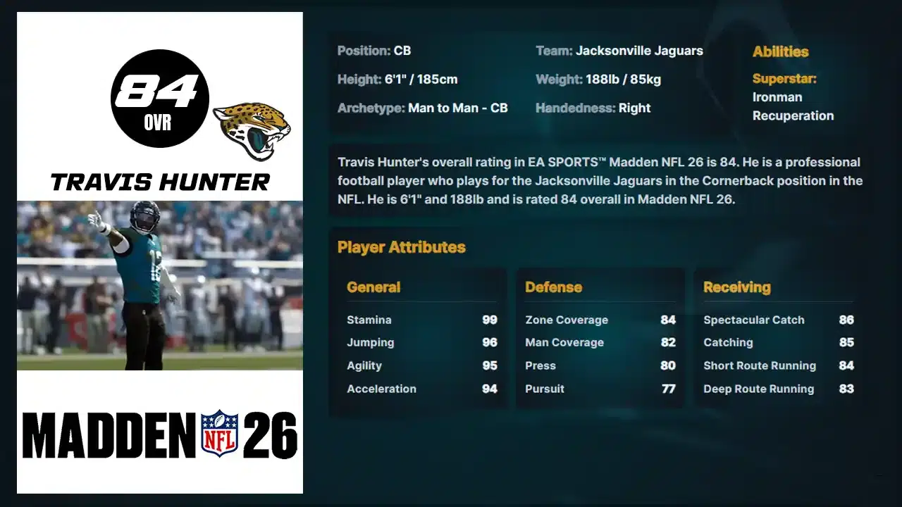 This Travis Hunter Player Ratings player breakdown explores the unique two-way abilities of the Jacksonville Jaguars’ star. With elite ratings as both a Cornerback and Wide Receiver, plus the ‘Ironman’ ability, Hunter offers unmatched versatility and strategic depth on the field.